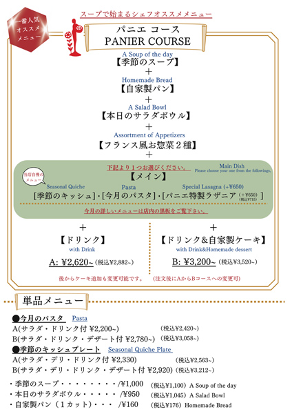 パニエでは料理自慢の祖母と母の家庭料理で味覚を育んだシェフが、その受け継いだレシピに、日本やフランスなど欧州で得た知識や経験を織り交ぜて、料理やデザートに表現しています。「おいしくて、こころやさしい空間を創る」をテーマに、季節感を意識し、身体を元気にするような食材を選び、丁寧に手作りしています。