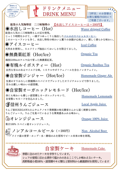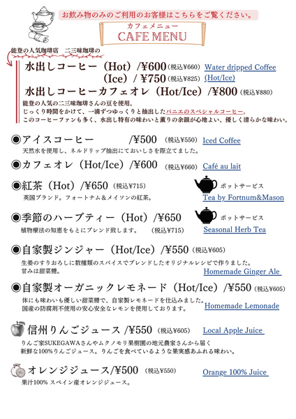 | 営業時間 | 11:30~16:00(LO お食事 14:00 / カフェ 15:30) 土曜日夜 18:00~21:00(LO 20:00) |