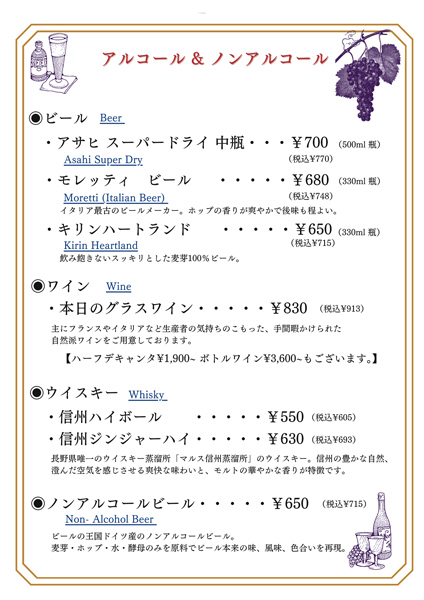 * 土曜日の夜はランチタイムと同じメニューを同じお値段でご利用いただけます。(特別ディナー日を除く)