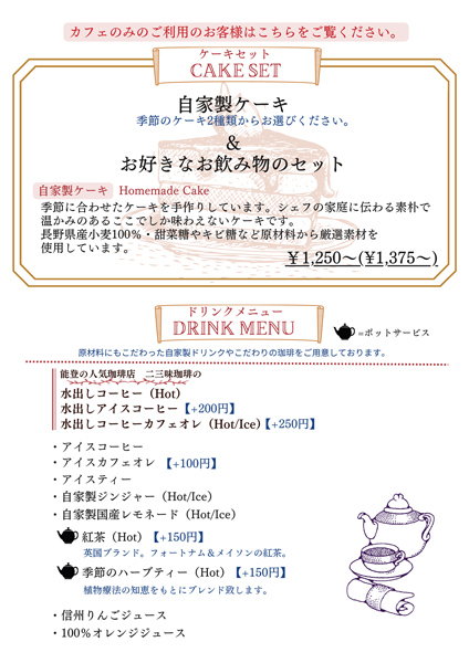 | 営業時間 | 11:30~16:00(LO お食事 14:00 / カフェ 15:30) 土曜日夜 18:00~21:00(LO 20:00) |
