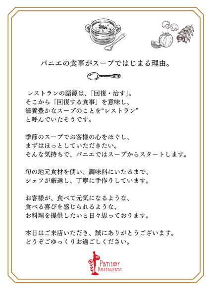 レストランの語源は「その人本来の姿に回復する、元気にする」という意味だそうです。パニエに来てくださる方々にとって、そのような役割でありたいと願っています。